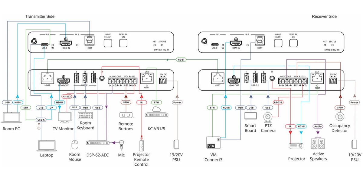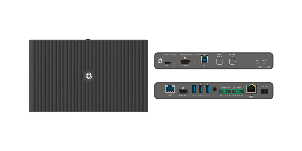 SWT3-21-HU-TR — автоматический коммутатор 2х1 с входом USB-C, двумя комбинированными входами HDMI/USB-B, выходом HDMI, а также портом HDBaseT 3.0, который может гибко настраиваться для передачи или приёма по линии витой пары сигналов 4K60 Гц (4:4:4) HDMI, USB 2.0, Ethernet, RS−232 и ИК. Также имеется три входа USB-A для подключения периферийных устройств в помещении (клавиатура, мышь, камера, саундбар и т.д.), которые можно переключать к активному хосту USB-B одновременно с подключением источника аудио-видеосигнала к дисплею с входом HDMI.