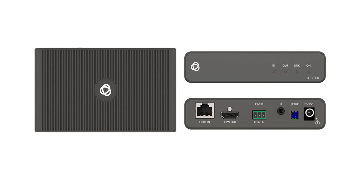 EXT3-H-R — приемник сигналов 4K60 (4:4:4) Гц HDR HDMI, RS−232 и ИК по кабелю витой пары в соответствие со стандартом HDBaseT 3.0. Прибор преобразует поступающий на его вход по кабелю медной витой пары сигнал HDBaseT 3.0 от совместимого передатчика в исходные видеосигнал и сигналы управления. Максимальное расстояние передачи составляет 40 м для видеосигналов разрешением до 4K@60 (4:4:4).