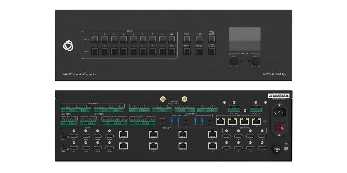 Матричный коммутатор 8x8 USB-C+HDMI с масштабируемыми выходами HDBaseT+HDMI, эмбедированием/деэмбедированием звука и независимой коммутацией эмбедированного звука, встроенным двухзонным аудио усилителем и энкодером H264/5; поддержка 4K60 4:4:4, PoE, Dante.