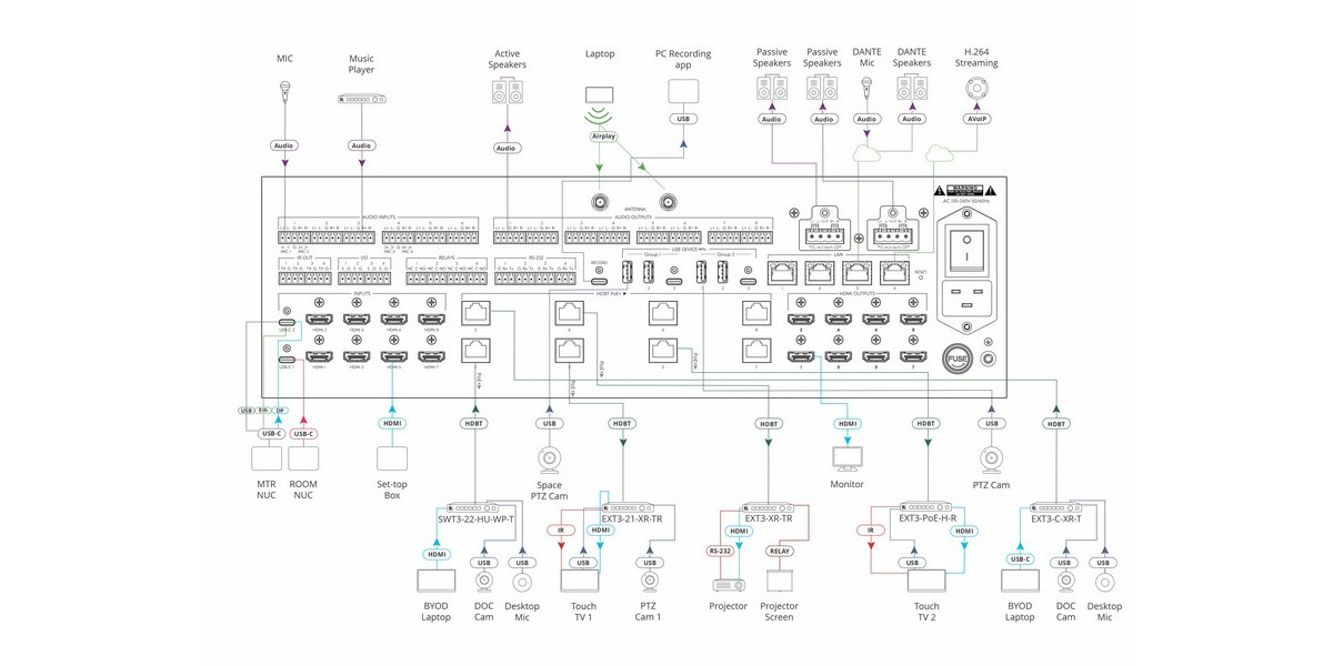 Возможность маршрутизации двух экранов USB−C позволяет подключить любой ноутбук с поддержкой Alt-mode DP и вывести изображение на любой выбранной паре выходов. Восемь портов расширения HDBaseT 3.0 с питанием удаленных устройств по PoE. Каждый порт HDBaseT 3.0 имеет настраиваемое направление (вход или выход) и может передавать несколько сигналов по медной витой паре, обеспечивая непревзойденную гибкость системы.