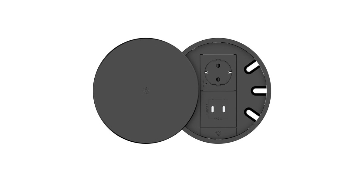 T-IN2-RND2 — встраиваемый в поверхность мебели для конференц-залов (стола, кафедры, трибуны и т.д.) круглый модуль с крышкой, предназначенный для кабельных подключений ноутбуков или иных персональных устройств участников. Модуль легко устанавливается с верхней стороны рабочей поверхности сквозь заранее подготовленное отверстие и фиксируется снизу посредством прижимных струбцин. При помощи рамки и двух модульных вставок с разъёмами формируется необходимая конфигурация. Вставки легко и быстро устанавливаются и фиксируются при помощи специального интегрированного запирающего устройства. Благодаря тонкой выступающей части, элегантному дизайну и двум доступным вариантам цвета встраиваемые модули T-In идеально интегрируются в рабочую поверхность, способствуя аккуратному виду рабочего места и не нарушая функциональность офисной мебели. Цвет: черный.
